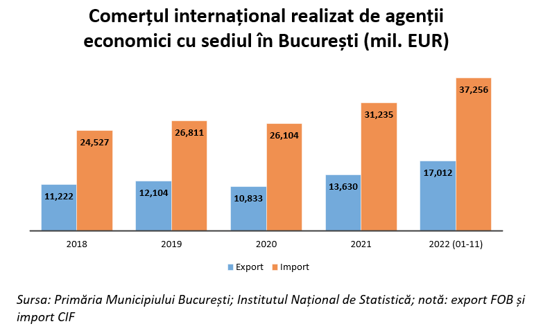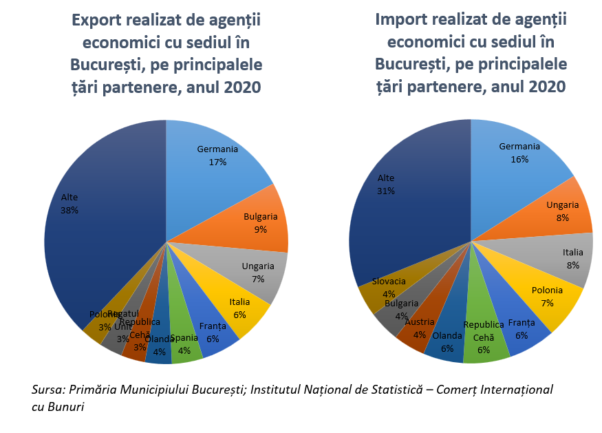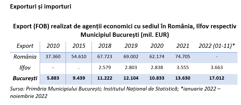 Ponderea exporturilor de produse vegetale este mult mai mare printre agenții economici din Municipiul București față de ponderea de la nivel național: la nivelul României doar 7% din exporturi sunt produse vegetale, iar la nivelul Municipiului București, ponderea acestora este de 24%. Alte produse ce au o pondere mai ridicată din valoarea a exporturilor în Municipiul București comparativ cu restul țării sunt: produsele minerale (în special combustibili și uleiuri minerale; materii bituminoase) și produsele chimice (în special produsele farmaceutice).