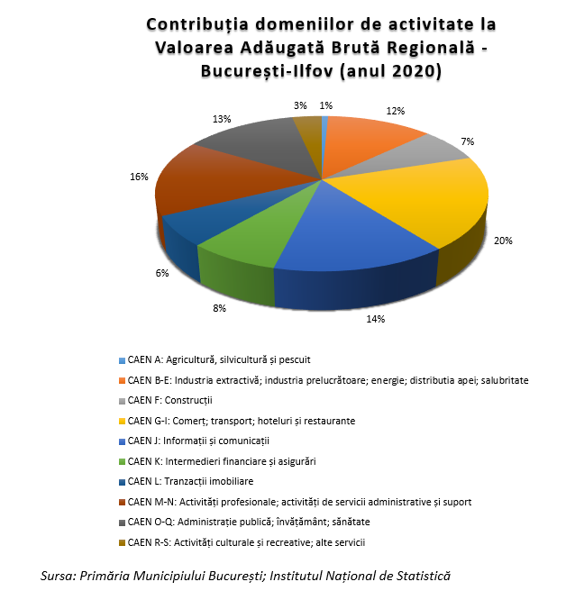 • G: Comerț cu ridicata și cu amănuntul; repararea autovehiculelor și motocicletelor: 49,2% în București față de 42% în România