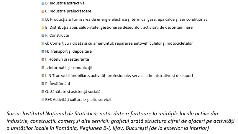 Ponderi mai ridicate din cifra de afaceri cumulată din Municipiul București față de România se observă la următoarele domenii de activitate: